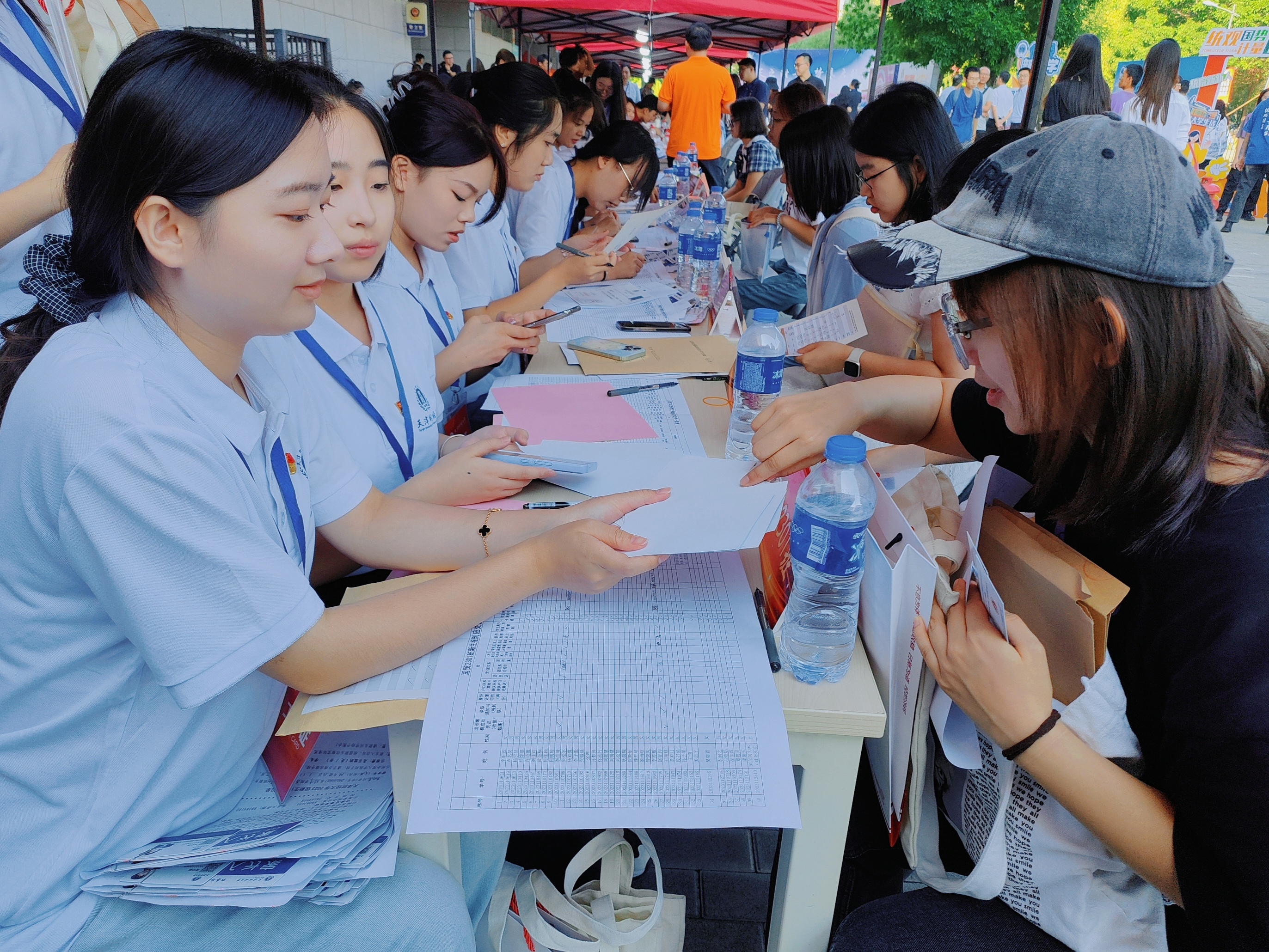 热忱可爱的学长学姐们正在耐心地指导报名流程。纸页翻动,细心讲解,一张张灿烂的笑脸,定格成了秋日最美的图画。