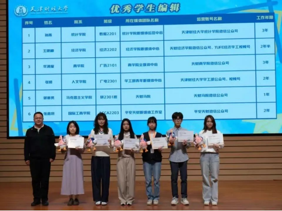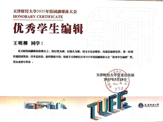 新媒体中心主任王明柳同学荣获“优秀学生编辑”称号。作为TUFE经济学工视频号的负责人,王明柳同学带领新媒体中心媒体部的成员,精心雕琢每一部作品。这些作品巧妙融合多元创意元素,每一帧画面都倾注着心血。这一荣誉不仅是对王明柳同学辛勤付出的高度认可,更有力彰显出六合彩
