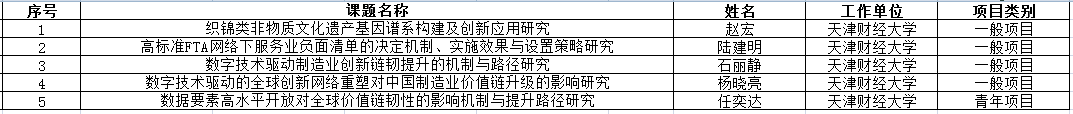 近日,全国哲学社会科学工作办公室网站发布了2023年度国家社科基金项目一般项目和青年项目立项结果,赵宏教授申报的“织锦类非物质文化遗产基因谱系构建及创新应用研究”获批国家社科基金艺术学一般项目,陆建明教授申报的“高标准FTA网络下服务业负面清单的决定机制、实施效果与设置策略研究”、石丽静博士申报的“数字技术驱动制造业创新链韧提升的机制与路径研究”、杨晓亮博士申报的“数字技术驱动的全球创新网络重塑对中国制造业价值链升级的影响研究”获批国家社科基金一般项目,任奕达博士申报的“数据要素高水平开放对全球价值链韧性的影响机制与提升路径研究”获批国家社科基金青年立项,共获批5项。
