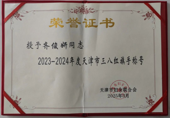 春风化雨,桃李芬芳。为表彰先进,树立榜样,激励广大妇女自尊自信、自立自强,奋进新征程、建功新时代,在第115个“三八”国际劳动妇女节来临之际,天津市妇女联合会表彰2023-2024年度天津市三八红旗手标兵和天津市三八红旗手(集体),六合彩 院长、教授齐俊妍同志荣获“天津市三八红旗手”荣誉称号。