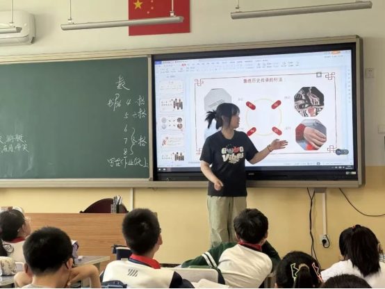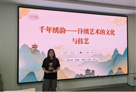 学生团队介绍了湘绣和鲁绣的悠久历史、工艺与纹样特征。起源于湖南长沙以针法精湛和色彩丰富著称的湘绣、与齐鲁文化紧密相连,以绣工精细、图案古朴典雅闻名的鲁绣深深吸引了小学生们,激发青少年们对非遗的兴趣、热爱和文化认同。